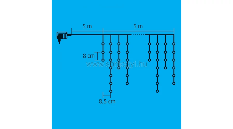 A KAF 300L 5M egy LED-es sziporkázó fényfüggöny. A termék igazi sajátossága, hogy 300 db melegfehér állófényű LED alkotja, de minden második füzérben található egy hidegfehér villogó LED is.
