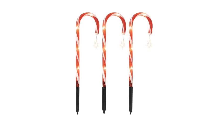 A világítási mód állandó, a beépített 6 órás be- és 18 órás kikapcsolási időzítő pedig kényelmes és energiatakarékos működést tesz lehetővé. A szett tápellátását 3 db 1,5V (AA) elem biztosítja, melyek nem tartozékok. A cukorbotok teljes magassága 47 cm, a leszúrótüske aljáig, míg maguk a cukorbotok 35 cm magasak. A karók közötti távolság 50 cm, és a tápkábel is 50 cm hosszú, így könnyedén elhelyezheti őket bárhol.